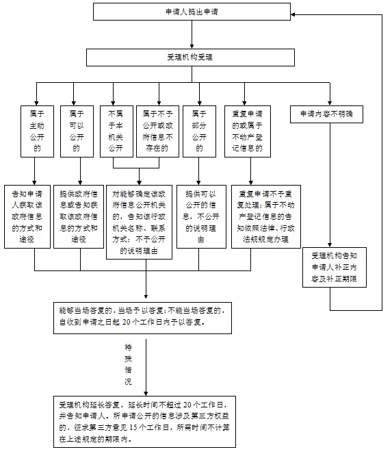 (1)本机关收到政府信息公开申请后,予以编号登记。除可以当场答复的外,自收到申请之日起20个工作日内予以答复;如需延长答复期限的,经本机关政府信息公开工作机构负责人同意并告知申请人,延长答复的期限最长不超过20个工作日。